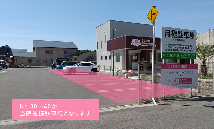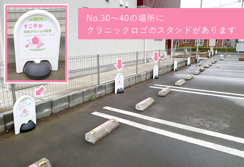 駐車場番号No.30~40が連携駐車場になります。クリニックロゴが入っているスタンドと車止めがございますのでご確認ください。