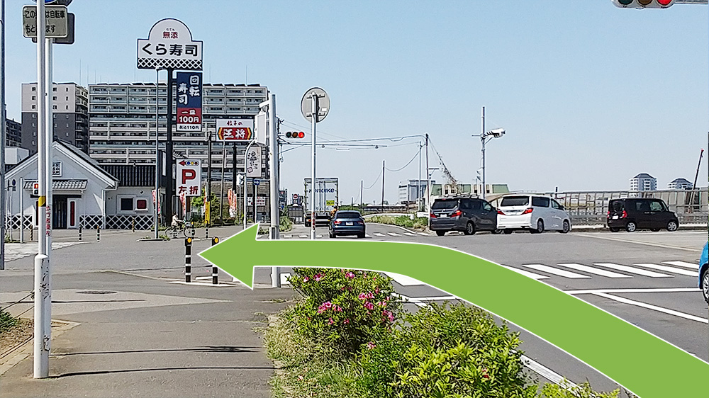 ①成田方面から白井方面へ向かう国道464号線にて、向かいにくら寿司が見える交差点にて左折いたします。