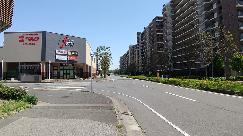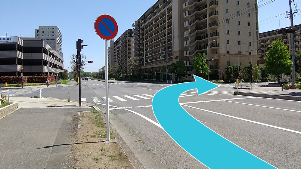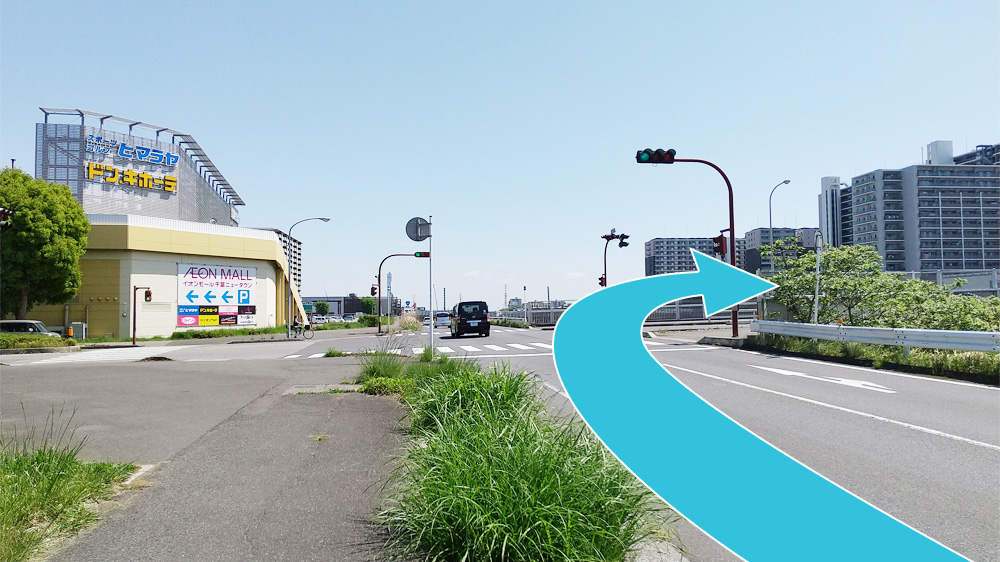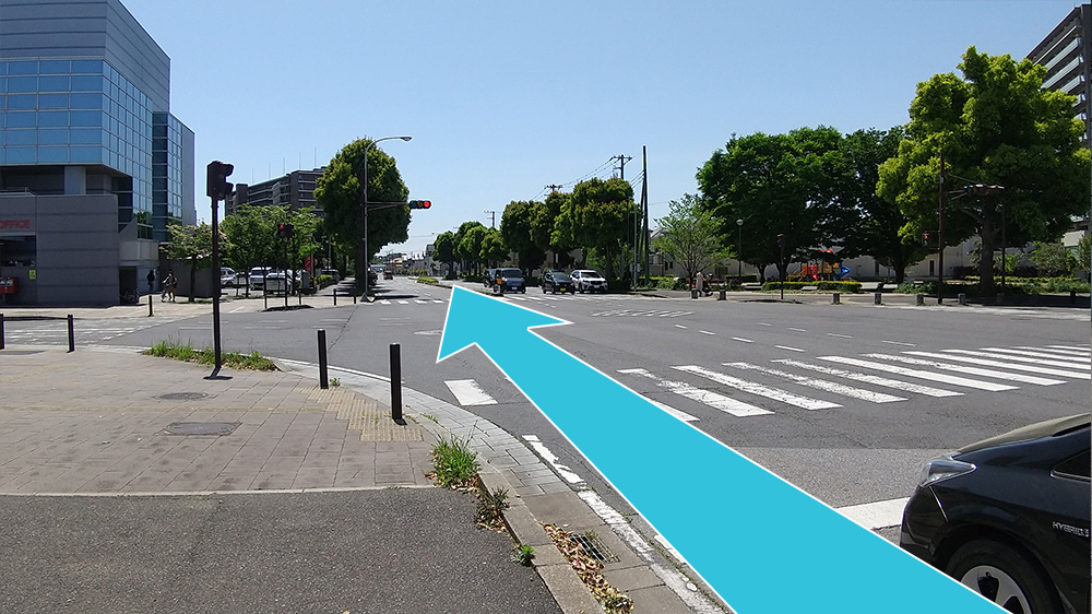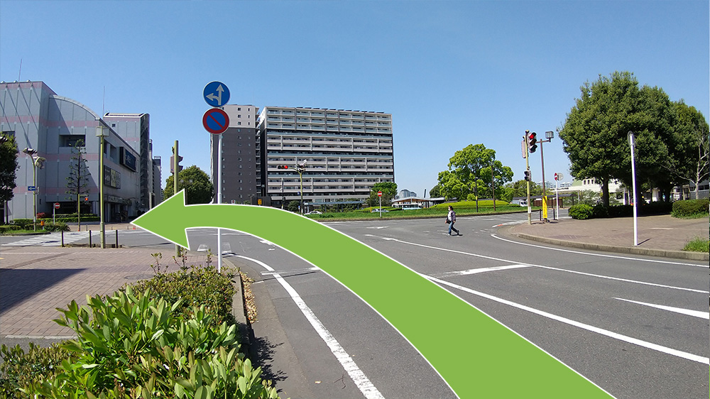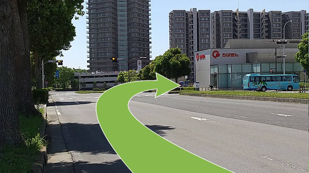 ②次に、通りの向かいに千葉銀行 千葉ニュータウン支店のある交差点がありますので、こちらで右折してください。