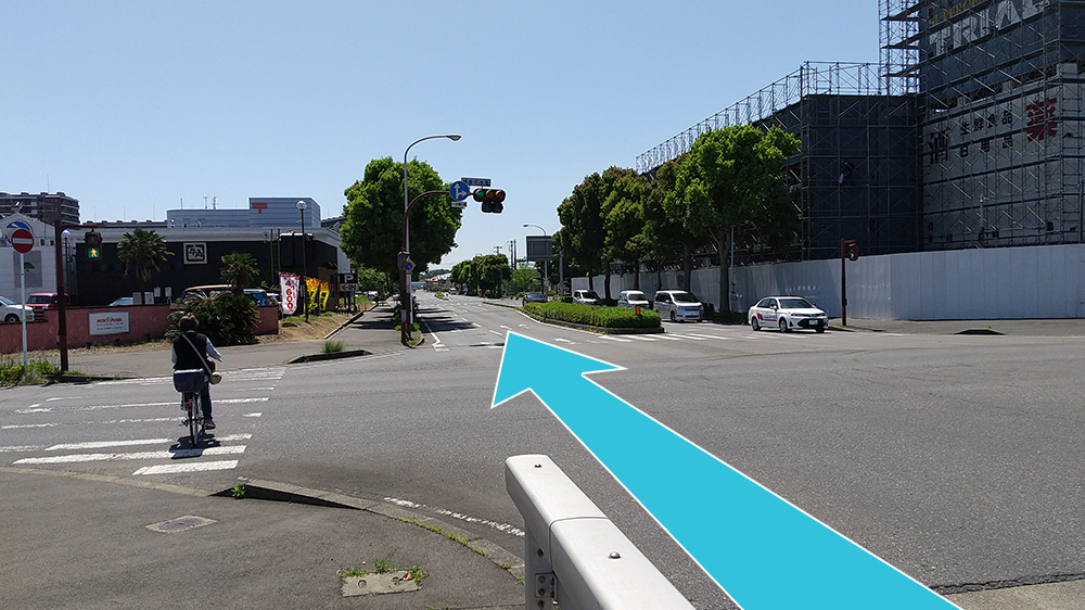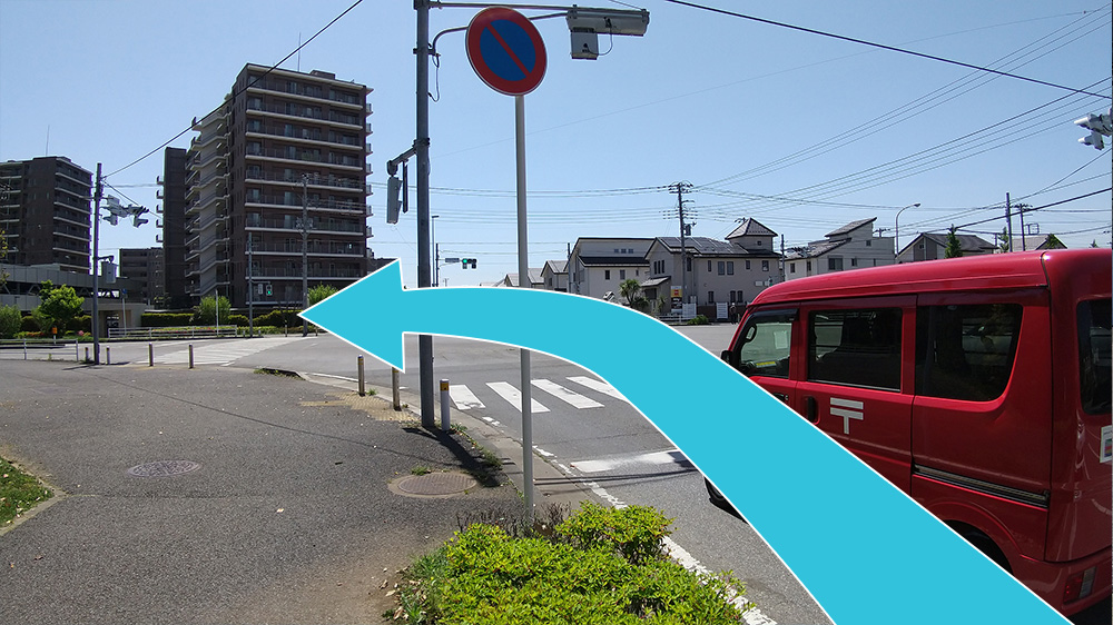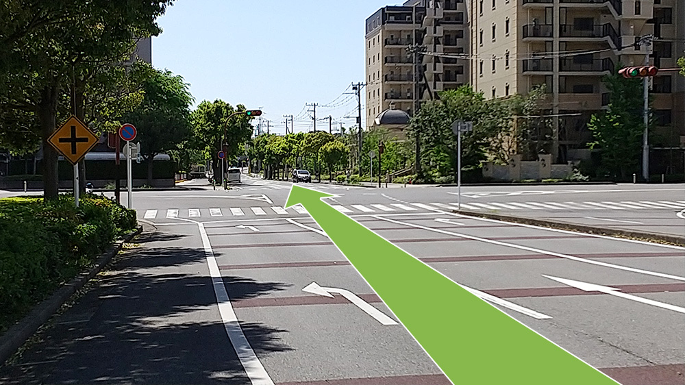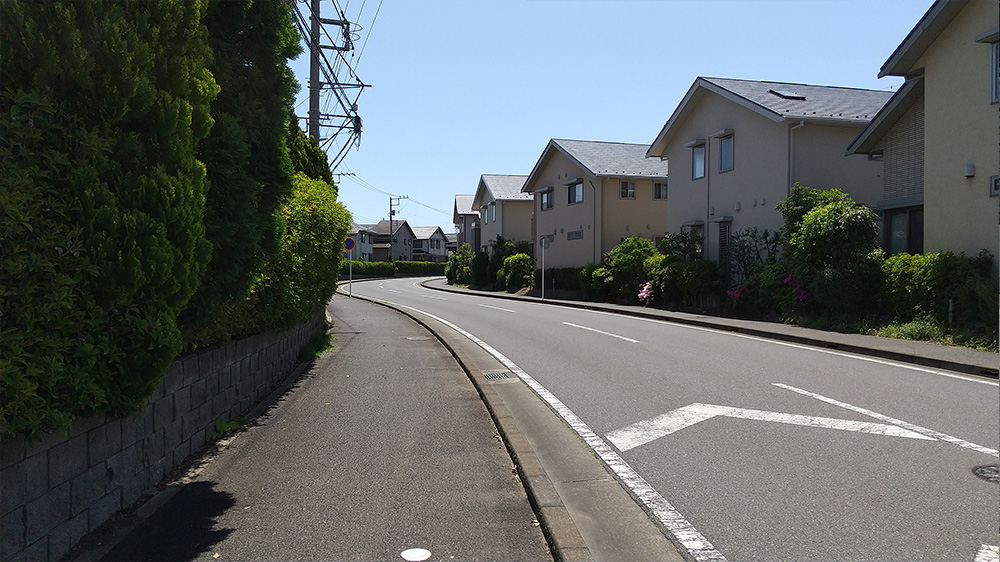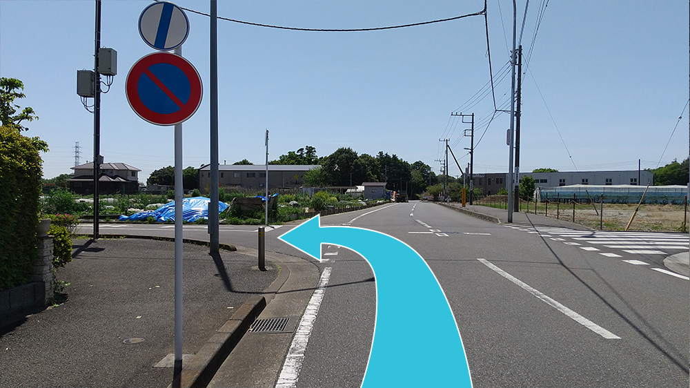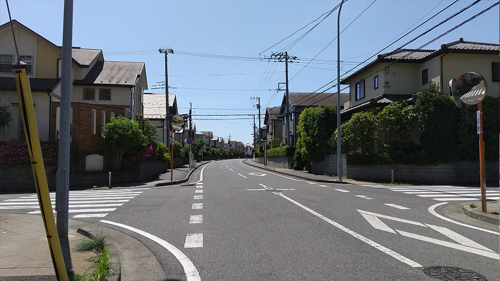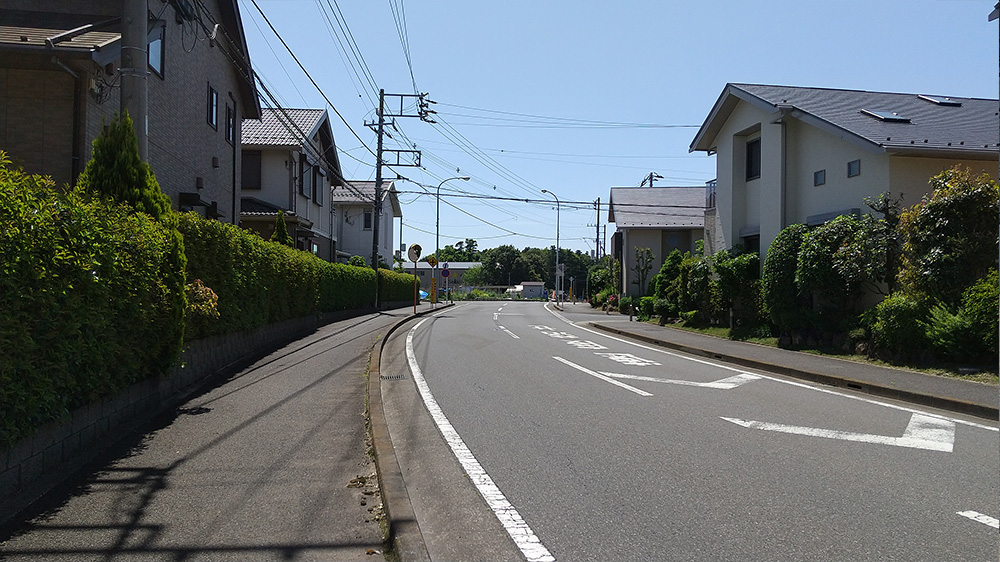 ⑧しばらく進むと住宅街を抜け切ります。奥が開けた交差点にさしかかりますので、こちらで左折してください。