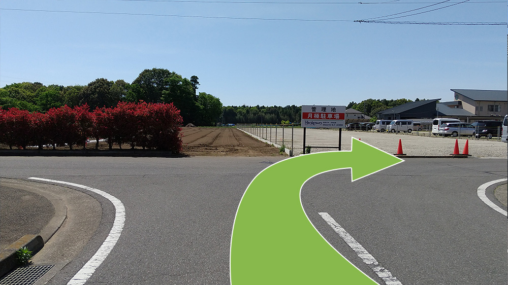 ①白井方面から成田方面へ向かう国道464号線にて、道の左手にドン・キホーテ千葉ニュータウン店が見える交差点にて右折いたします。