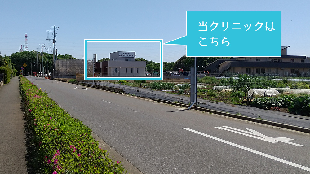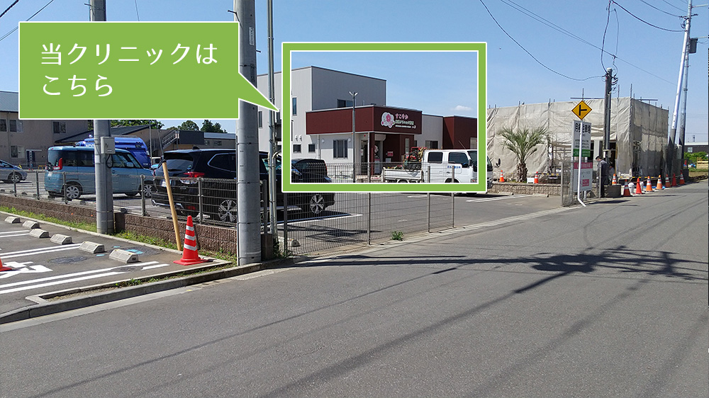通り沿いに当クリニックがございます。手前には専用駐車場をご用意しておりますのでご利用ください。